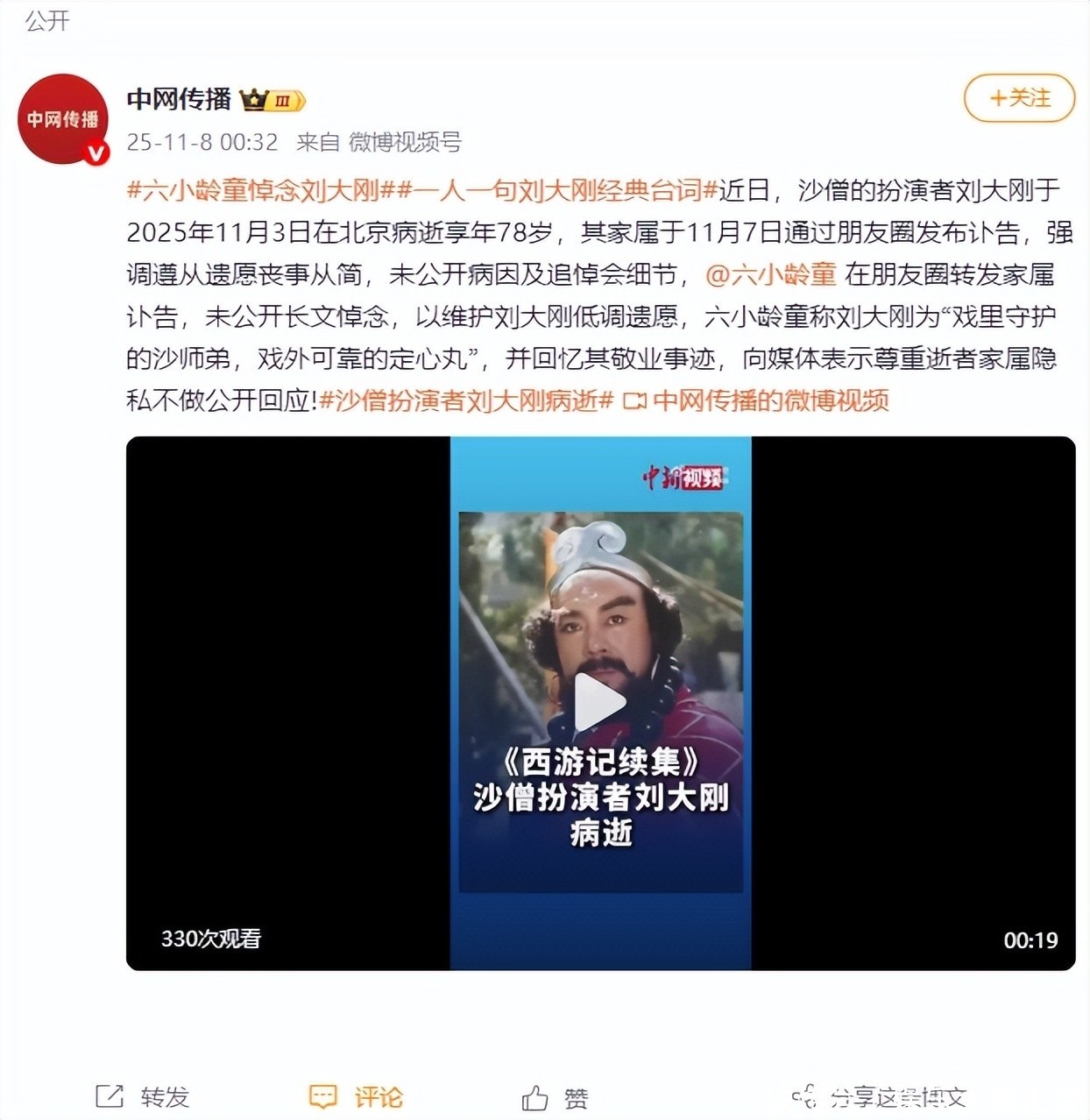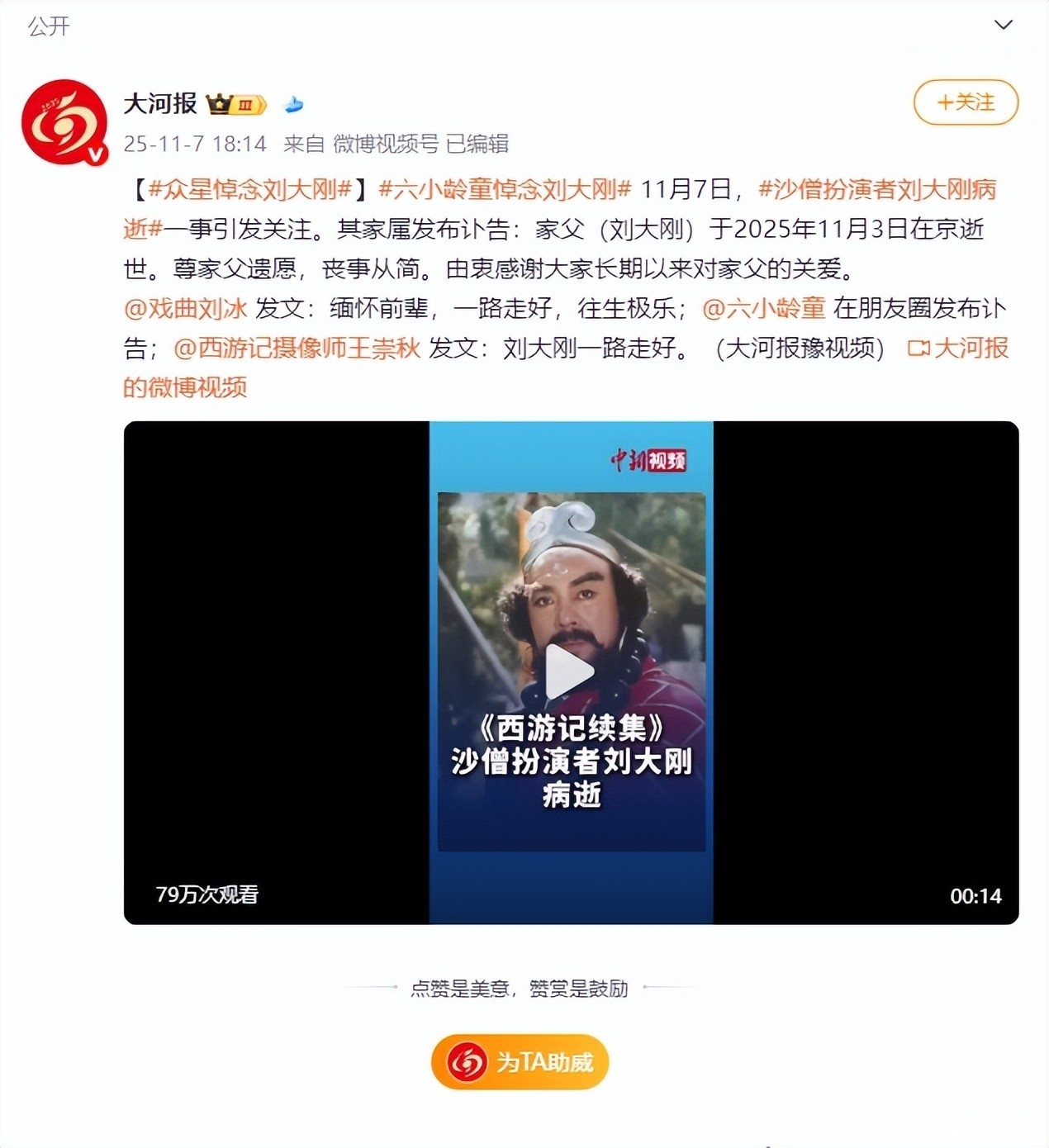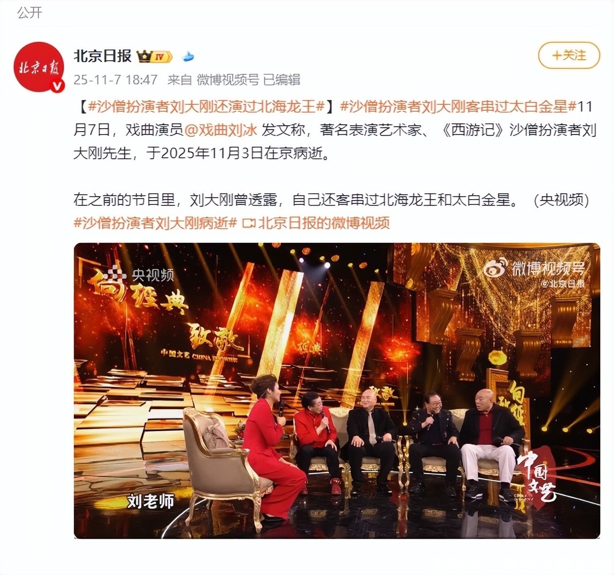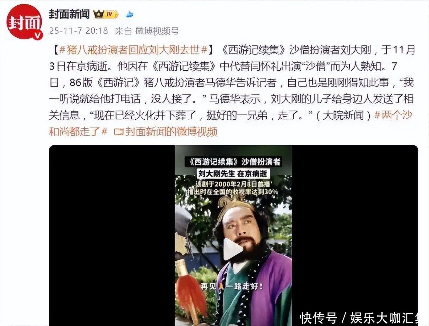 《西游记》中沙僧饰演者刘大刚老师于11月3日在京因病辞世。